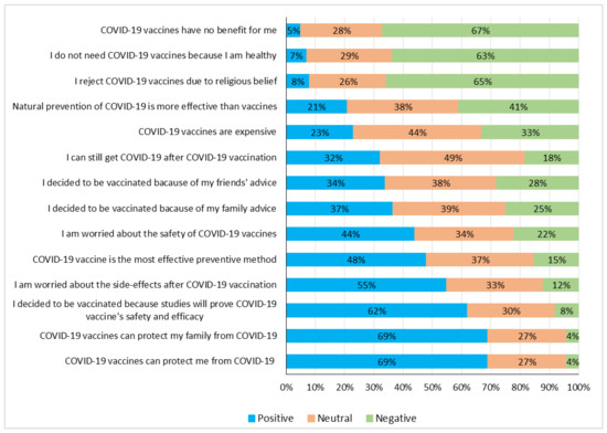 A high level of vaccine hesitancy undermines COVID-19 vaccination efforts, ultimately putting society and the community at greater risk of the disease, primarily healthcare workers (HCWs). Frontline HCWs are more susceptible to contracting COVID-19 [16]. Therefore, the WHO designated them as a top priority for receiving COVID-19 vaccines once they were available [17]. Vaccinating healthcare workers is crucial for lowering infection rates, preventing severe COVID-19 complications, and alleviating the pressure on health systems due to healthcare staff shortages. In addition, healthcare workers are considered one of the most trusted sources of information on vaccines and vaccination by the general public [18]. Therefore, negative sentiments towards the COVID-19 vaccine and vaccination among healthcare workers will profoundly influence the general public’s perception of the vaccines [19]. Several studies have demonstrated that vaccine acceptance among the general public declines if it is not recommended or if concerns are raised by their respective healthcare workers [19,20]. Several studies conducted in different countries have demonstrated varied levels of COVID-19 vaccine acceptance among healthcare workers [19,20,21,22]. It is of utmost importance to understand the factors that influence healthcare workers’ attitudes towards COVID-19 vaccines and vaccination to develop interventions and strategies to address the concerns and build confidence in vaccines and vaccination programs.