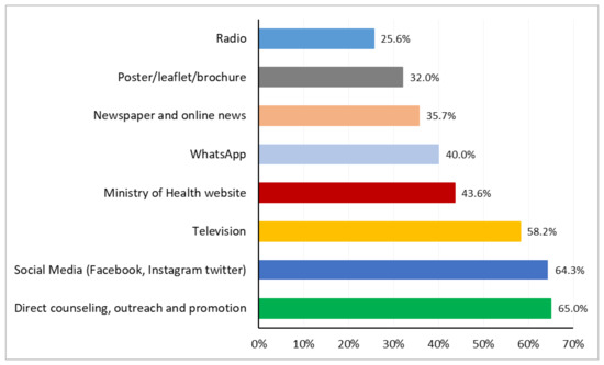 The participants were also asked about the most suitable media for disseminating information on COVID-19 vaccines and vaccination in Indonesia. The majority of the participants, i.e., 65% and 64.3%, highlighted direct counselling, outreach and promotion, and social media (Facebook, Instagram, Twitter) as the most suitable platforms. Television and the Ministry of Health website were listed as the third (58.2%) and fourth (43.6%) most suitable media for communication. Posters/leaflets/brochures and radio were considered the least preferable media for communicating information on COVID-19 vaccines and vaccination (Figure 4).