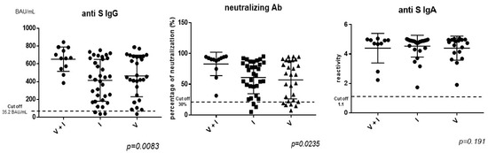 Anti-S IgG antibodies were tested using a quantitative immunoenzymatic assay (EUROIMMUN Medizinische Labordiagnostika AG, Lübeck, Germany), with results expressed in RU/mL, and transformed in BAU/mL using a conversion factor of 3.2 [21]. The results were considered negative if <8 RU/mL (<25.6 BAU/mL); borderline if between 8–11 RU/mL (25.6–35.2 BAU/mL); positive > 11 RU/mL (>35.2 BAU/mL).