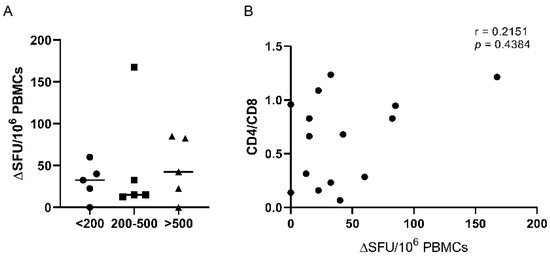 Detectable IFN-γ producing T cell responses were present in 13 out of 15 evaluated patients (86.7%), including two patients with CD4 < 200 cells/mm3 who did not display any serological markers of SARS-CoV-2 infection. There were no detectable IL-2-secreting T cells. Subjects without immunosuppression (>500 CD4 cells/mm3) respond better to re-stimulation, although the cellular immune response displays individual heterogeneity. The non-parametric Spearman test did not detect any correlation between anti-SARS-CoV-2-specific cellular response and the CD4/CD8 ratio (r = 0.2151; p = 0.4384) (Figure 4B).