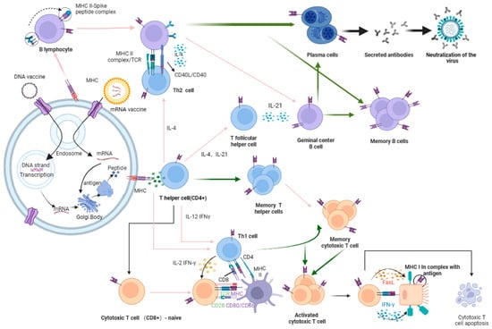 Researchers have demonstrated that DNA and mRNA themselves present immunogenicity or adjuvanticity, which instigates innate immunity and induces cytokines, enhancing the cellular and humoral immune responses and vice versa. The diagram also illustrates the inherent memory function of the immune system, which is reflected in the generation of memory T cells that rapidly respond to previous infectious events and protect against future infections [14,15].