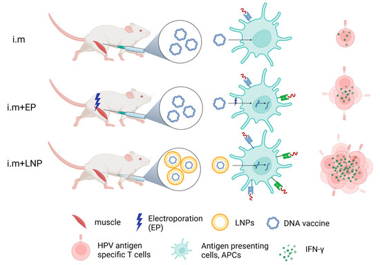 Schematic diagram of immune effects of therapeutic HPV DNA vaccine with different delivery strategies. Created with BioRender.com (DBA BioRender #2961-9728).