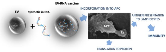 The activation of adaptive immunity by an mRNA construct encapsulated into extracellular vesicles (EVs). EVs protect the mRNA from degradation and allow for its penetration into mucosal epithelial cells and antigen-presenting cells (APCs). Here, it is translated into the encoded protein which, after processing, is displayed on the cell surface complexed with MHC molecules. The interaction of APCs with lymphocytes (Ly) allow them to recognize the foreign protein and become activated.