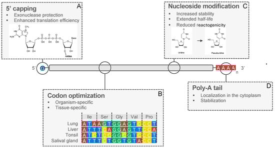 The translation of mRNA into functional proteins is contingent upon optimizing key elements within mRNA constructs. The stability and translation efficiency of mRNA sequences can be improved through modifications of the 5′ cap region, codon optimization, modifications of nucleosides, the 3′poly-A tail, and other means. Select aspects are summarized in Figure 2.