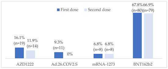 Regarding the mechanism of action, mRNA vaccines (75.6%) predominated over adenovirus vector vaccines (25.4%). The most frequently administered vaccine was the BNT162b2 mRNA vaccine (67.8%), followed by the AZD1222 adenovirus vector vaccine (16.1%). The types of vaccines administered are shown in Figure 1.