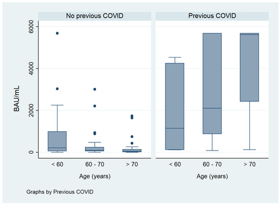 Influence of age on degree on humoral response stratified by previous COVID-19.