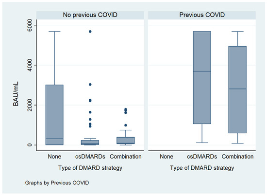 Stratification by the DMARD treatment strategy showed a lower degree of response for csDMARDs (in monotherapy or combination) with respect to the combination of csDMARDs with bDMARDs or JAKi (p = 0.018). Number of doses of vaccine and mRNA vaccines were significantly associated with a higher degree of response in patients with previous COVID-19 (p = 0.036 and p = 0.027, respectively). Numerically higher levels of antibodies were also found in patients without previous COVID-19, although it did not reach statistical significance.