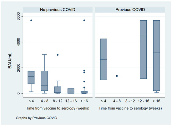 Anti-SARS-CoV-2 IgG antibody titers were obtained with the SARS-CoV-2 IgG II QUANT Alinity technique (Abbott® (Abbott, Maidenhead, UK)) and defined the serological response to the vaccine. Humoral response to the vaccine was considered negative if <7.1 binding antibody units (BAU/mL) and positive if ≥7.1 BAU/mL. The first antibody titers available after complete vaccination were selected. Time elapsed (weeks) from the completion of the vaccination to the determination of the serological response was recorded, owing to its variability due to the non-availability of serological tests to measure vaccine humoral response at the initial phases of the vaccination period.