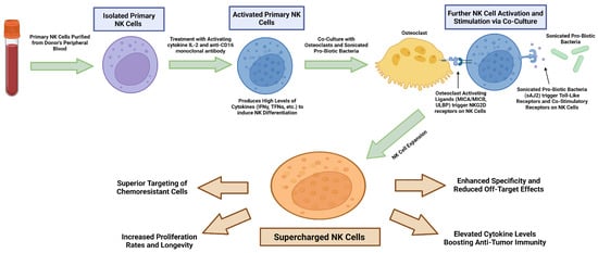 Schematic presentation of generation and characteristics of supercharging NK cells. NK cells (NK cells (0.5 × 106 cells/2 mL)) are purified from the peripheral blood of human donors and are treated with a combination of IL-2 (1000 U/mL) and anti-CD16mAb (3 µg/mL) overnight. Activated NK cells are then co-cultured with osteoclasts and probiotic bacteria (1:2:4: osteoclasts: NK: PB). Media were refreshed every three days for an average of 27–36 days. Supercharged NK cells exhibit significantly increased functional activity in comparison to primary NK cells.