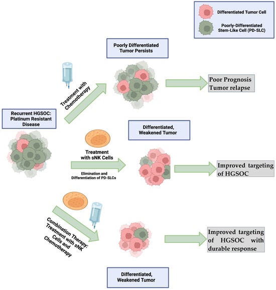 Hypothetical presentation of effective therapeutics for ovarian cancer. Chemotherapy alone could target well-differentiated tumors, but not PDSCSs, which could result in tumor recurrence. sNK cells induce killing against both PDSLCs and well-differentiated tumors and induce the differentiation of PDSLCs. A combination of sNK and chemotherapy could be the most effective strategy to eliminate the heterogeneous population of ovarian tumors: sNK therapies could help to kill both PDSLCs and well-differentiated tumors and induce the differentiation of PDSLCs, which could then allow chemotherapy to clean well-differentiated and NK-induced differentiated tumors.