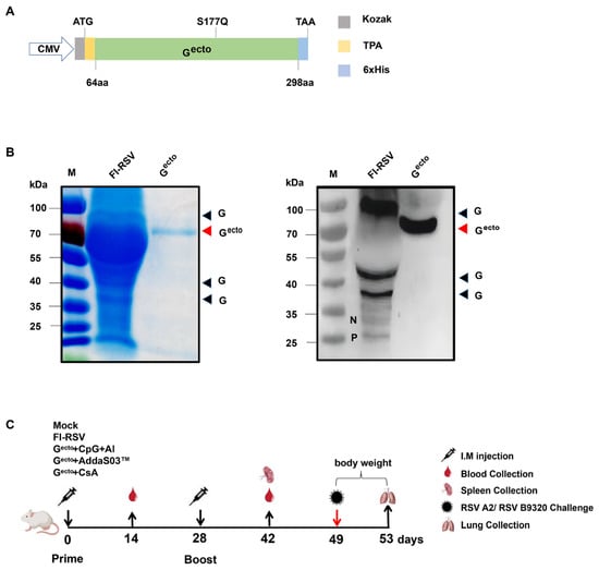 Characterization of the vaccine and scheme of animal experiment in this study: (A) construction diagram of the recombinant plasmid pVRC-RSVGecto; (B) sodium dodecyl sulfate–polyacrylamide gel electrophoresis and Western blot analyses of purified Gecto protein and G antigen expression in FI-RSV, where the black arrow points to the G protein (varying glycosylation differences), while the red arrow indicates Gecto; (C) scheme of vaccination, detection, and viral challenge in mice.
