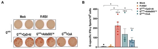 Assessment of the RSV G-specific cellular immune response in Balb/c mice using the ELISPOT assay: (A,B) representative plots for IFN-γ expression. Splenocytes were stimulated with RSV G-specific stimulation peptide (NPTCWAICKRIPNKKPGKKT) and ELISPOT assay results for RSV G-specific IFN-γ-secreting spots per million splenocyte mononuclear cells (n = 5). The spots in B represent detection result from five mice each group (* p < 0.05).