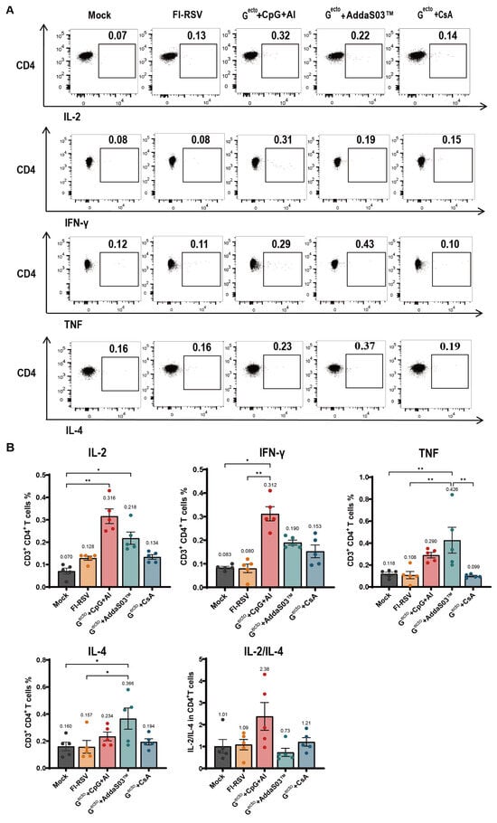 Detection of intracellular cytokines IFN-γ, TNF, IL-2, and IL-4 in CD4+ T cells from Gecto-immunized mice. (A) Representative flow cytometry plots for intracellular cytokines expression by CD4+ T cells. Splenocytes were stimulated with the RSV G-specific stimulation peptide, which was assessed via a flow cytometry assay (n = 5). (B) Percentages of RSV G-specific cytokine-positive cells among total CD4+ T cell populations in the splenocytes of mice detected by ICS (n = 5). The spots in (B) represent detection result from five mice each group (* p < 0.05, ** p < 0.01).