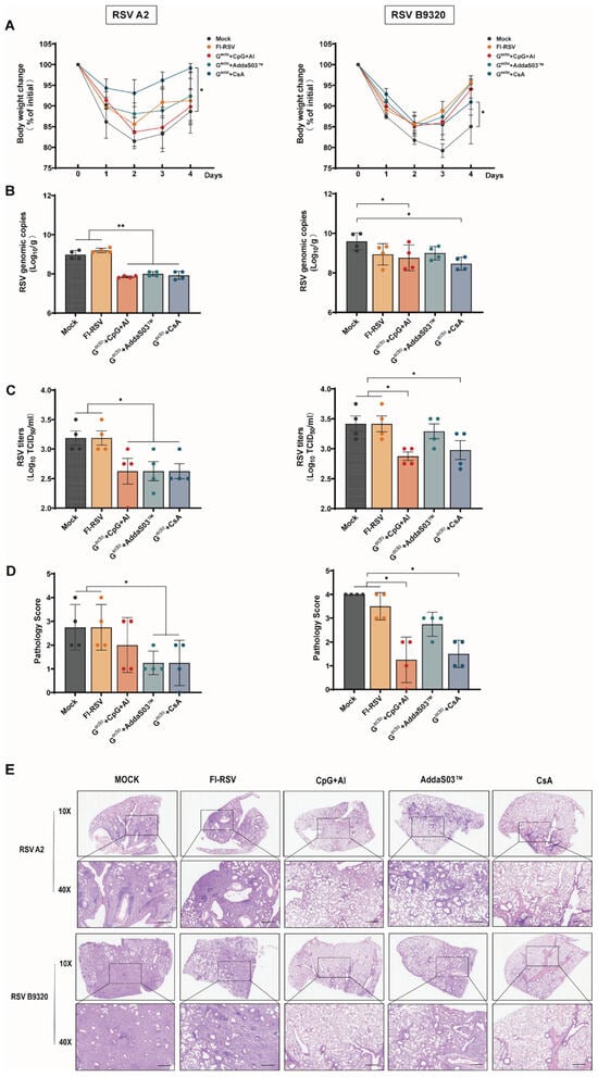 The pathological analysis of the lung tissue from mice was performed 4 days after the RSV challenge. Compared to the control group, all RSV Gecto-immunized groups showed reductions in interstitial pneumonia lesions after RSV A2 or B9320 challenge (Figure 5D,E). Both the mock and FI-RSV groups had higher pathological scores than the RSV Gecto immunization groups. The RSV Gecto + CpG + Al and RSV Gecto + CsA groups exhibited milder pathological injury rates than the RSV Gecto + AddaS03™ group, which is consistent with the RSV load reduction detected using the TCID50 assay.