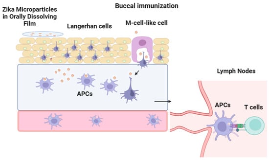 Zika MPs loaded in ODFs in the buccal mucosa. Once the Zika MPs are released from the thin film, the MPs are taken up by APCs and M-cell-like cells to process the Zika MPs. After processing, the APCs enter the blood and travel to nearby lymph nodes to initiate contact with T cells to mount a strong immune response to the Zika virus.