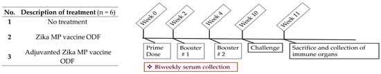 Groups of mice (n = 6) in the in vivo study (left). Timeline of the in vivo study (right) assessing the dosing status of the prime dose followed by two booster doses of the Zika MP vaccine ODF and the adjuvanted Zika MP vaccine ODF when administered via the buccal route. Challenge on Swiss Webster mice was conducted on week 10. After one week, at week 11, mice were sacrificed, and immune organs were collected.
