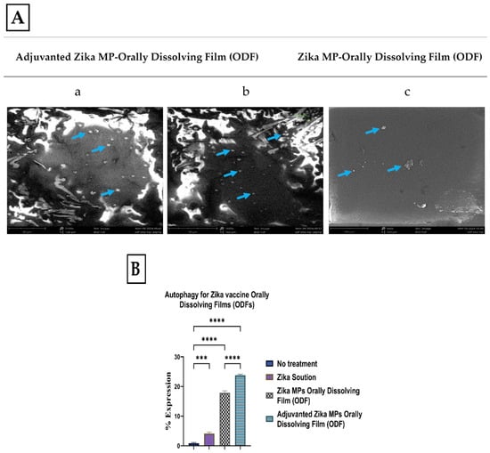 Scanning electron microscopy (SEM) images of adjuvanted Zika MP-loaded ODFs and Zika MP-loaded ODFs (A). Blue arrows in image (a–c) indicate presence of microparticles in ODFs. (a): 2100×, 5 kV, BSD full; (b): 1650×, 5 kV, BSD full; (c): 640×, 5 kV, BSD full. In (B), autophagy results for percentage expression for autophagosomes. Zika MP ODF and Adjuvanted ODF had a higher expression of autophagosomes than the no treatment and Zika solution. ***, p < 0.001; ****, p < 0.0001.