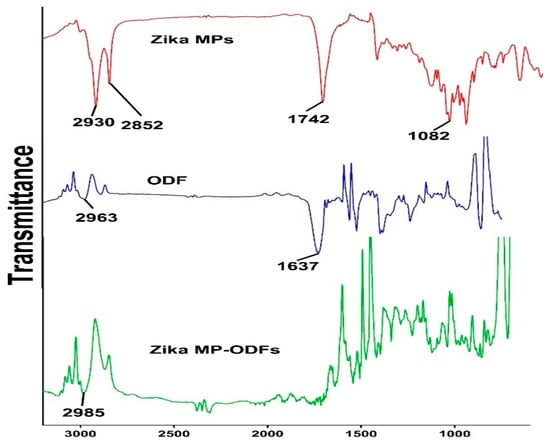 FTIR spectra of Zika MPs (red), blank ODFs (no vaccine microparticles) (blue), and Zika microparticles loaded in ODFs (green). In the Zika MP (red) FTIR spectra, several main peaks are visible at 2930 cm−1, 2852 cm−1, 1742 cm−1, and 1082 cm−1. The spectrum of the blank ODF showed two main peaks at 2963 cm−1 and 1637 cm−1. Zika MPs loaded in ODFs showed a peak at 2985 cm−1, but the disappearance of 2852 and 1082 was observed for Zika MPs, suggesting successful incorporation of Zika MPs in the oral dissolving films (ODFs).