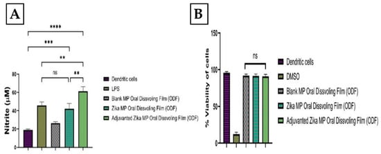 The Griess assay measured ZIKV vaccine microparticle immunostimulatory potential in vitro [,]. Nitric oxide released by dendritic cells 2.4 (DC) was quantified for blank ODFs, Zika MP vaccine ODF, and adjuvanted Zika MP vaccine ODF, with cells only and Lipopolysaccharide (LPS) as controls (Figure 6A). Both vaccine groups showed significantly higher NO release than untreated cells. Vaccine microparticles’ cytotoxicity was assessed using the MTT assay (Figure 6B) []. DCs treated with different treatment groups for 24 h showed no cytotoxic effects. Negative and positive controls were cells only and DMSO. The formulated vaccine microparticles in the ODFs were non-cytotoxic.