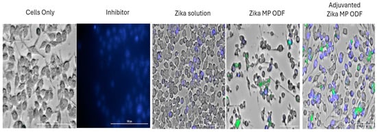 Autophagosome induction was observed using an autophagy assay. Green fluorescence protein-conjugated light chain 3 (GFP-LC3 puncta) is representative of active autophagy, while blue (DAPI, 1 mg/mL) represents nuclear staining. Cells only or Dendritic cells, rapamycin inhibitor, Zika solution (60 μg/mL), Zika MP ODF (60 μg/mL), and Zika MP ODF (30 μg/mL) + adjuvant MPs (30 μg/mL) , (images are in 100 µm). Zika MP ODF (p < 0.0001) and the adjuvanted Zika MP ODF had greater expression of autophagosomes than the cells treated with only the negative control or the Zika solution.