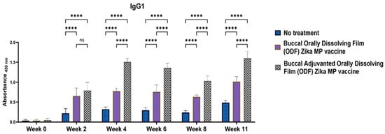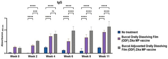 Measurement of the serum ZIKV-specific IgG titer via ELISA []. Animals received one prime dose at week 0 and two booster doses at weeks 2 and 4 via buccal administration. Compared with those in the untreated control group (weeks 2, 4, 6, 8, and 11), mice that received the Zika MP vaccine and the MP adjuvant via ODFs exhibited significantly greater antibody titers. Adjuvanted ZIKV vaccine MP induced significantly greater antibody titers than did the Zika MP vaccine (weeks 2, 6, 8, and 11). The data are presented as the means ± SEMs; Brown–Forsythe ANOVA test followed by Tukey’s multiple comparison test; ns, nonsignificant; ***, p < 0.001; ****, p < 0.0001.