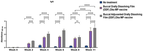One of the objectives in formulating a buccal Zika MP vaccine was to ascertain the presence of IgA antibodies. The presence of mucosal IgA antibodies elicited through the buccal route can play a critical role in neutralizing the virus at a potential site of entry. Figure 9 shows the robust IgA titer detected postvaccination. Our findings demonstrate significant and sustained production of IgA antibodies over the long term. Evaluation of IgA antibodies revealed that the adjuvanted Zika MP vaccine ODF induced robust IgA antibody levels at weeks 2, 4, and 6, which decreased at week 8 but increased post-challenge at week 11. Both adjuvanted and unadjuvanted Zika MP vaccine ODF formulations elicited significantly greater IgA titers than the no-treatment group.