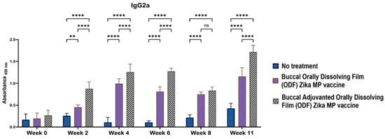 The humoral response was assessed in Swiss Webster mice following buccal administration using ODFs. Mice received a prime dose followed by two booster doses administered two weeks apart (at week 2 and week 4). Enzyme-linked immunosorbent assay (ELISA) was used to analyze the serum samples that were collected biweekly [,]. IgG antibodies, being the most abundant in serum and crucial for long-term immunity against infections, were of particular interest. Figure 8 depicts the Zika-specific IgG titers observed in Swiss Webster mice. The ZIKV vaccine and the unadjuvanted ZIKV vaccine groups exhibited robust total IgG antibody responses. IgG titers were significantly higher from weeks 2 to 11 compared to the untreated group. Notably, IgG titers remained significantly elevated in both adjuvanted and unadjuvanted vaccinated groups even after the challenge at week 10. The adjuvanted Zika MP vaccine induced a robust IgG antibody response at weeks 2, 4, 6, 8, and 11 compared to mice receiving no vaccine. In addition, other antibodies were measured, including IgA and IgG subtypes (IgG1, IgG2a, and IgG3).