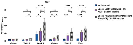 Measurement of the serum Zika-specific IgG3 titer via ELISA []. Mice received one prime dose at week 0 and two booster doses at weeks 2 and 4 via buccal administration. Zika MP vaccine ODF generated strong IgG3 antibodies at week 4, which then gradually decreased following a pattern similar to that of the adjuvanted Zika MP vaccine ODF. Adjuvanted Zika MP vaccine ODF produced significant IgG3 titers during weeks 2–11. The data are presented as the means ± SEMs; Brown–Forsythe ANOVA test followed by Tukey’s multiple comparison test; ns, nonsignificant, *, p < 0.05, **, p < 0.01, ***, p < 0.001, ****, p < 0.0001.