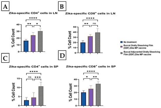 Helper CD4+ helper and CD8+ cytotoxic T cells were analyzed following a prime dose at week 0 and two booster doses at weeks 2 and 4. Zika-specific cellular T-cell responses following buccal immunization using ODFs were measured via flow cytometry []. In Figure 13, T-cell responses are shown for lymph nodes (CD4+ helper (A) and CD8+ cytotoxic T cells (B)) and spleen (CD4+ helper (C) and CD8+ cytotoxic (D)). The vaccine induced significant CD4+ helper and CD8+ cytotoxic T-cell surface marker cellular responses after buccal vaccination. Lymph nodes elicited a significant percentage of CD4+ helper and CD8+ cytotoxic T cells. In the spleen, the vaccine, with or without adjuvants, produced significantly higher CD8+ cytotoxic T cells than CD4+ T cells. The data are presented as the means ± SEMs; Brown–Forsythe ANOVA test followed by Tukey’s multiple comparison test; ns, nonsignificant; *, p < 0.05; **, p < 0.01; ***, p < 0.001; ****, p < 0.0001.