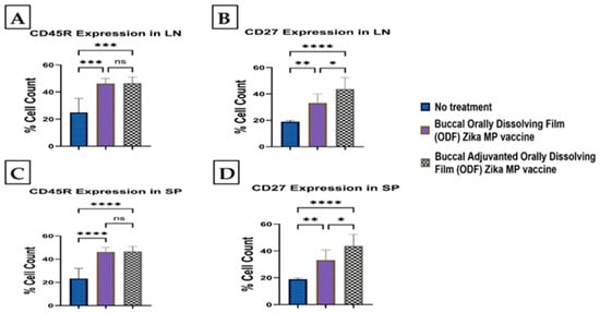 Flow cytometry was utilized to measure the Zika-specific expression of CD45R (A) and CD27 (B) memory markers in lymph nodes, as well as the Zika-specific expression of CD45R (C) and CD27 (D) T cells in the spleen. Swiss Webster mice received a prime dose at week 0, followed by two booster doses (at week 2 and week 4). The buccal ODF Zika MP vaccine and the adjuvanted ODF Zika MP vaccine elicited a significant CD45R and CD27 memory response as shown by the percent cell count following buccal vaccination. Both CD27 and CD45R markers were present in the lymph nodes, while both memory markers were detected in the spleen as well. (Data presented as Mean ± SEM, analyzed using Brown–Forsythe ANOVA test followed by Tukey’s multiple comparison test; ns, non-significant, *, p < 0.05, **, p < 0.01, ***, p < 0.001, ****, p < 0.0001).