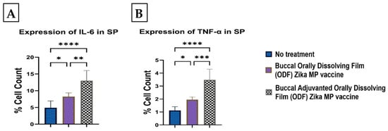 To evaluate the memory response triggered by our Zika MP vaccine, we examined CD45R and CD27 markers in the spleen and lymph nodes (Figure 14). Robust expression of memory B cell markers was observed in both immune organs. In lymph nodes, more significant levels of CD45R and CD27 markers were induced (Figure 14A,B) by the vaccine, with and without adjuvants, compared to the no-treatment group. The adjuvanted vaccine displayed a higher CD27 count percentage compared to the unadjuvanted vaccine, although CD45R expression did not significantly differ between them (Figure 14B). In spleen tissue, both CD45R and CD27 markers showed a significant memory response (Figure 14C,D), with adjuvanted and unadjuvanted vaccines inducing higher responses than the no-treatment group. Notably, CD27 expression was prominently high in both spleen and lymph nodes (Figure 14B,D), while CD45R expression was significantly elevated in both tissues (Figure 14A,C). However, the expression of CD45R in both the adjuvanted and unadjuvanted Zika MP vaccine groups was significantly higher than in the no-treatment group (Figure 14D). Figure 15 shows the Zika-specific expression of intracellular markers in the spleen. In the spleen, the expression of intracellular cytokines IL-6 (A) and TNF-α (B) was notably elevated compared to the group receiving no treatment. Specifically, the expression of IL-6 was significantly higher, with levels approximately fourfold greater than those of TNF-α. Furthermore, the adjuvanted Zika MP vaccine ODF elicited significantly higher levels of both IL-6 and TNF-α cytokines compared to both the untreated and naïve groups.