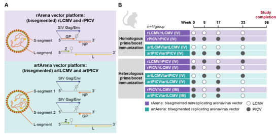 Vector constructs (A) and immunogenicity study design (B). Schematic diagram of constructs: rArena vector platform (trisegmented; A, upper panel) and artArena vector platform (trisegemented; A, lower). Heterologous LCMV and PICV vectors for prime vs. boost yielded comparable magnitude ELISpot responses by IV route; thus, both rLCMV/rPICV and rPICV/rLCMV and both artLCMV/artPICV and artPICV/artLCMV group responses were combined into a single group (each n = 8). Homologous vaccination refers to when prime and boost were administered with the same vector delivering identical immunogen. Heterologous vaccination refers to when two different vectors of the same platform were used to deliver identical immunogen.