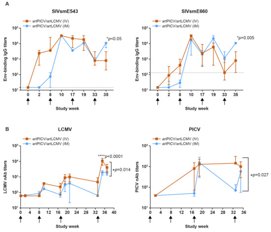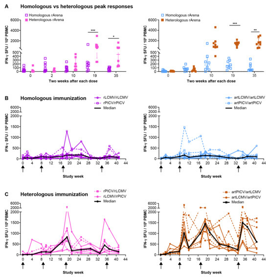 We also investigated the effect of the vaccination route on SIV-specific cellular responses for comparing both vector platforms. To this end, we analyzed the magnitude of total (Gag + Env) IFN-γ ELISpot responses elicited by artArena and rArena vectors when administered IM. The artPICV/artLCMV vectors consistently induced higher cellular responses than rPICV/rLCMV, but these differences became statistically significant only after the fourth dose (p < 0.05, two-way ANOVA Šidák multiple-comparison test; Figure 4B and Supplementary Figure S5).