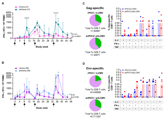 Comparison between SIV immunogenicity elicited after immunization with artArena and rArena arenavirus vector administered IV (A) and IM (B). Heterologous LCMV and PICV vectors for prime vs. boost yielded comparable magnitude ELISpot responses by IV route; thus, both the rLCMV/rPICV and rPICV/rLCMV and both artLCMV/artPICV and artPICV/artLCMV group responses were combined into a single group (each n = 8) and referred as rPICV/rLCMV and artPICV/artLCMV, respectively. ELISpot responses up to week 10 were measured on frozen PBMCs, and after 10 weeks, on freshly isolated PBMCs for IV groups. Freshly isolated PBMCs were evaluated for IM groups. Black arrows represent PICV vector immunization. Statistical significance for each timepoint was determined by two-way ANOVA Šidák multiple-comparison test, and for curve comparison, linear mixed-effect model was used. **** p < 0.0001, * p < 0.05 (A) Median responses of all the animals of heterologous IV group of both artArena and rArena vector groups, side by side, on the same graph from Figure 2C for comparison and statistical analysis. (C,D) SIV-specific Gag (C) and Env (D) CD8 T-cell polyfunctionality after fourth vaccination of rPICV/rLCMV and artPICV/rLCMV vector (IV) in NHPs (n = 4 each group). Intracellular cytokines evaluated include IFN-γ, IL2, and TNF-α in CD8 T cells by multiparametric flow cytometric analysis. Frequencies of T cells positive for single (purple color), double (green color), and triple (pink color) cytokines are plotted as pie charts.