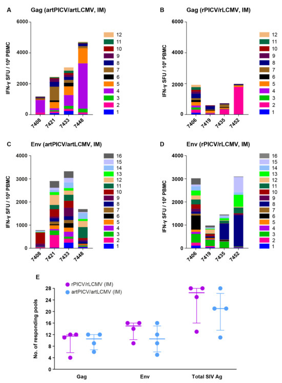 Breadth of SIV-specific responses 2 weeks after the fourth dose of heterologous immunization of rPICV/rLCMV and artPICV/artLCMV vectors when administered IM. ELISpot response breadth was evaluated using 12 Gag (A,B) and 16 Env peptide subpools (C,D) at 2 weeks after fourth dose of rPICV/rLCMV and artPICV/artLCMV IM; response was defined as >3× background signal; lines and error bars represent the median ± IQR. (E) Responses to total number of Gag and Env pools (10 MER pools) elicited after IM immunization with SIV immunogen encoding rPICV/rLCMV and artPICV/artLCMV vectors.