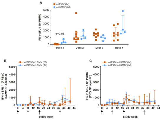 Comparison between IV and IM immunization of artPICV/artLCMV vectors for generating SIV-specific IFN-γ ELISpot in naïve NHPs. (A) SIV-specific IFN-γ responses 2 weeks after each dose of IV and IM heterologous immunization of replicating vector. (B) LCMV NP-specific IFN-γ ELISpot response. (C) PICV NP-specific IFN-γ ELISpot response after immunization with heterologous boost of artPICV/artLCMV arenavirus IV and IM. Data represent magnitude of anti-vector NP-specific IFN-γ ELISpot response (B,C) over the course of study, plotted as median ± IQR (n = 4). Statistical significance for timepoint was determined by Wilcox with Benjamini–Hochberg multiple correction test * p = 0.03. Black arrows represent PICV vector immunization, and grey arrows represent LCMV vector immunization.