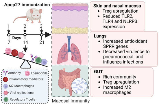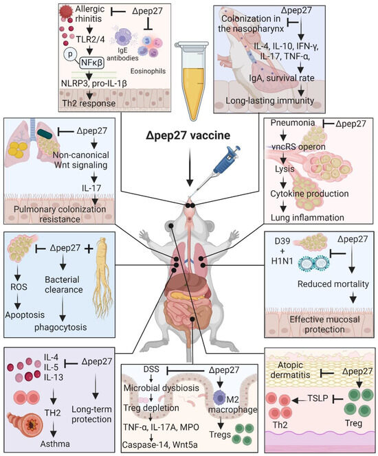 ∆pep27 immunization in various inflammatory diseases. Mice were intranasally immunized with ∆pep27, 3 times, once a week, with 1 × 108 CFU. Experimental diseases were induced via the appropriate methods for specified days until the mice were sacrificed. Collectively, several parameters such as IgG level, M2 macrophages, and Treg cells were induced via ∆pep27 immunization. However, inflammatory mediators using cytokine and chemokine transcription factors in pneumococcal and virus models were suppressed. Image created using the BioRender application (biorender.com).