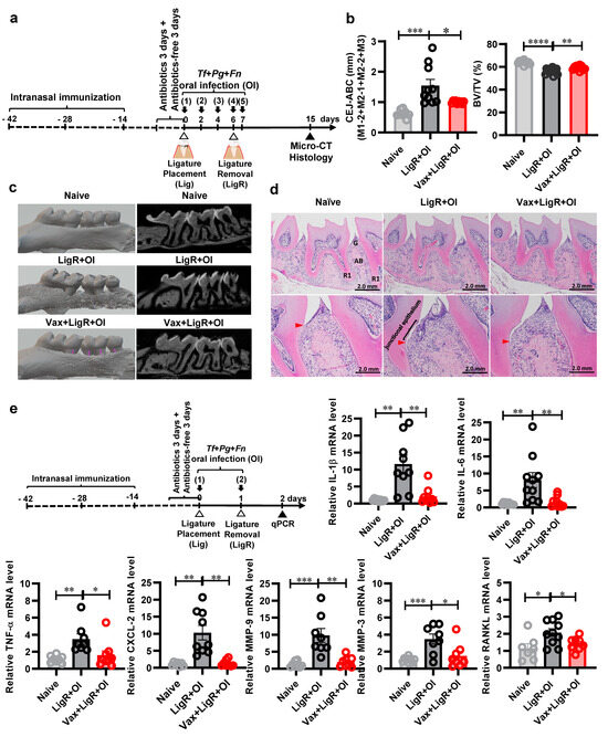 To evaluate the effectiveness of the trivalent mucosal vaccine in preventing Tf-, Pg-, and Fn-mediated alveolar bone loss, we performed a series of experiments combining intranasal vaccination and a LigR + OI challenge. BALB/c mice were intranasally immunized with a trivalent vaccine formulated with Tf-FlaB-tBspA (BtB), Pg-Hgp44-FlaB (HB), and Fn-FlaB-tFomA (BtA). Two weeks after the last immunization, we challenged vaccinated animals with the temporary-ligature–oral infection regimen (Figure 1a). Nine days after ligature removal, we assessed the effectiveness of induced immune responses by measuring the extent of alveolar bone loss. Mice vaccinated with the trivalent vaccine (Vax + LigR + OI group) were effectively protected from alveolar bone loss caused by an infection with a mixture of Tf, Pg, and Fn. This was evidenced by assessments of CEJ-ABC (LigR + OI vs. Vax + LigR + OI, p < 0.05) and the bone volume density (BV/TV) (LigR + OI vs. Vax + LigR + OI, p < 0.01) (Figure 1b,c). The vaccine efficacy is discernible in histologic H&E staining (Figure 1d), as shown by the attenuated degradation of periodontal tissue around the second molar. Moreover, vaccination consistently resulted in a significant reduction in myeloperoxidase-positive neutrophil infiltration (Supplementary Figure S4). These findings demonstrate that the trivalent mucosal vaccine (BtB + HB + BtA) prevents alveolar bone loss caused by mixed PD pathobiont infection.