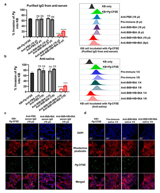 An invasion assay was also conducted to assess whether the anti-sera and anti-saliva from the trivalent vaccine can neutralize the activities of Hgp44, inhibiting the invasion of KB cells by Pg. Non-specific antibodies (anti-BtB + BtA and anti-PBS) were utilized as negative controls. The outcomes demonstrated a significant reduction in the percentage of Pg invasion into KB cells with both IgG purified from anti-sera (Figure 5a,c) and anti-saliva (Figure 5b,d) elicited by BtB + HB + BtA immunization. Conversely, treatment with purified IgG from serum or saliva from BtB + BtA- or PBS-administered animals showed no inhibition. These results suggest that the specific inhibitory effect of immune sera or saliva against Hgp44 also contributed to the suppression of Pg-mediated inflammation.