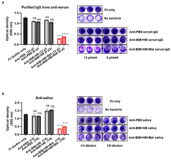 The anti-sera and anti-saliva produced by the trivalent vaccine prevent the formation of Fn-mediated biofilm. The inhibition of Fn biofilm formation. (a,b) Fn (1 × 109 cells) was pre-incubated with IgG purified from anti-sera (equivalent to 12 μL/well or 6 μL/well) or anti-saliva (1/4 or 1/8) from mice vaccinated with PBS (anti-PBS), a divalent vaccine (anti-BtB + HB), or a trivalent vaccine (anti-BtB + BtA + HB) for 3 h at RT, followed by overnight incubation at 37 °C under anaerobic conditions (85% N2, 10% H2, and 5% CO2). Following a gentle wash with PBS, the wells were stained with 0.3% crystal violet for 15 min. The stained biofilm was extracted with 100% ethanol and diluted twofold with PBS, and the absorbance was measured at 595 nm. The right panels represent a microscopic observation of the crystal violet-stained biofilm. The presented data represent the mean ± SEM for each group, and the experiments were conducted with three replicates. *** p < 0.001, **** p < 0.0001, and ns indicates non-significance.