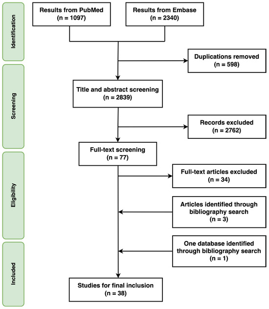 The literature search yielded 2839 articles after removing duplicates, of which 77 were identified for full-text review based on their titles and abstracts. Among these 77 articles, 34 met the inclusion and exclusion criteria. Additionally, three articles [29,30,31] and one database [32] were identified through bibliography searches and included in the final review (Figure 1).