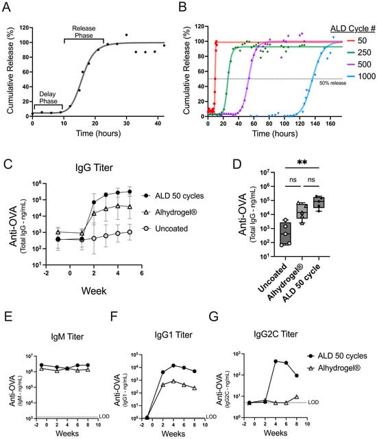 In vitro dissolution and early antibody responses kinetics. (A) The in vitro dissolution from powder coated with 100 ALD cycles is presented as a percentage of the total content released over time. Individual data points are depicted (dots) with a four-parameter, nonlinear logistic (4PL) regression (line). (B) The in vitro dissolution curves are shown for powders coated with 50, 250, 500, and 1000 ALD cycles. A dotted line at 50% gives an approximation of the inflection point for each 4PL regression (Supplementary Table S2). (C,D) Mice (n = 5) were vaccinated on day 0 with 500 ng OVA either from uncoated spray-dried powder (gray circles) or a 50-cycle ALD-coated powder (black circles), or with an Alhydrogel® formulation (open triangles). (C) OVA-specific total IgG from serum was plotted over time as the GMT for each group with 95% confidence intervals. (D) OVA-specific total IgG serum titers at two weeks post-injection are shown as box plots (+/−; min/max), with an overlay of individual data points. (E–G) Mice (n = 5) were vaccinated on day 0 with 250 ng OVA either from 50-cycle ALD-coated powder (black circles) or formulated with Alhydrogel® (open triangles). The serum from the individual mice was pooled at each timepoint, and titer concentrations for each timepoint are reported for OVA-specific IgM (E), IgG1 (F), or IgG2C (G) antibodies. The statistical analysis for panel D was performed by Kruskal-Wallis ANOVA with Dunn’s post-hoc test (a = 0.05) ** indicates p-value = 0.0044, ns indicates not significant, and # indicates number.