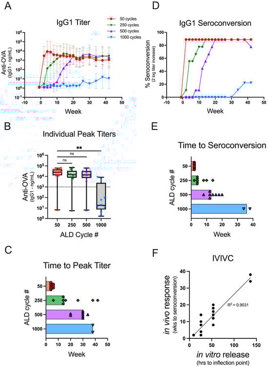 Coat thickness delays the antibody response times in vivo. Mice (n = 9) were administered a single 250 ng dose of OVA on day 0 using reconstituted powders coated with 50 (red circle), 250 (green diamond), 500 (purple triangle), or 1000 (blue triangle) cycles of ALD, which increases the coat thickness. Individual animal sera were analyzed for OVA-specific IgG1 antibody titers over the course of 42 weeks. (A) The GMT for each animal group is depicted over time with 95% confidence intervals. (B) The peak titers are shown for each group as box plots (+/−; min/max) with an overlay of individual data points. The dotted line on the graph at 103 ng/mL represents a cutoff between the responders and non-responders. (C) The time to peak titer for each individual mouse (excluding the non-responders) is shown, and the bars extend to the median time to peak titer for the group. (D) The percent seroconversion (as determined by a two-log increase in titer over pre-vaccination) is shown for each group over the course of 42 weeks. (E) The time to seroconversion for each individual mouse is shown, and the bars extend to the median time to seroconversion for the group. (F) An in vitro to in vivo correlation was drawn by plotting the time to the inflection point of the in vitro dissolution (Figure 1B, Supplementary Table S2) against the individual mouse times to seroconversion. The correlation line was generated using a simple linear regression. Statistical analysis for panel B was performed by Kruskal-Wallis ANOVA with Dunn’s post-hoc test (α = 0.05) ** indicates p-value = 0.0024, ns indicates not significant, and # indicates number.