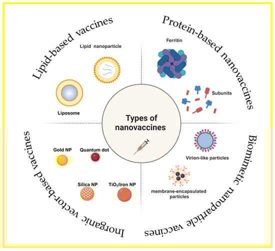 Worldwide, the development of vaccines against SARS-CoV-2, the organism that causes the novel coronavirus disease, is imperative. The use of nanovaccines, which improve vaccine administration and immunogenicity by incorporating nanotechnology, is a key tactic in the fight against this pandemic. Based on the carrier structure classification, vaccine delivery systems utilizing nanoparticles may be broadly divided into four categories: vaccines based on lipids, vaccines based on inorganic vectors, vaccines based on proteins, and vaccines employing biomimetic nanoparticles (Figure 2) [,,]. The current phase of SARS-CoV-2 nanoparticle vaccine research is characterized by rapid innovation and growth, partly due to the urgent need for scalable and effective immunization strategies. Nanoparticle delivery platforms for drugs and vaccines have demonstrated promise in producing robust immune responses and offering stability and convenience of manufacturing—a vital combination for global immunization programs. Because of their adaptability, nanoparticle platforms may be quickly rearranged to include the sequences of recently identified strains, offering a way to update vaccinations in response to shifts in viral evolution [,]. Creating a nanoparticle vaccine to combat SARS-CoV-2 requires technological innovation to enhance its functional design, broaden its accessibility, and boost its adaptability to the virus’s ongoing evolution.