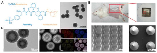 The inorganic carrier vaccine’s functional design to prevent SARS-CoV-2. (A) The cross-neutralization of SARS-CoV-2 strains stimulated by dimer RBD antigen is improved by amantadine-assembled nanostimulants []. (B) To incorporate the RBD of the SARS-CoV-2 spike protein into a microneedle patch vaccination, CpG 1018 and a graphene-based double adjuvant system are used []. (C) By interacting with Mn2+, the manganese–silicon nanoplatform (MnOx@HMSN) improves the adjuvant action of the CDN for SARS-CoV-2 vaccination and cancer [].