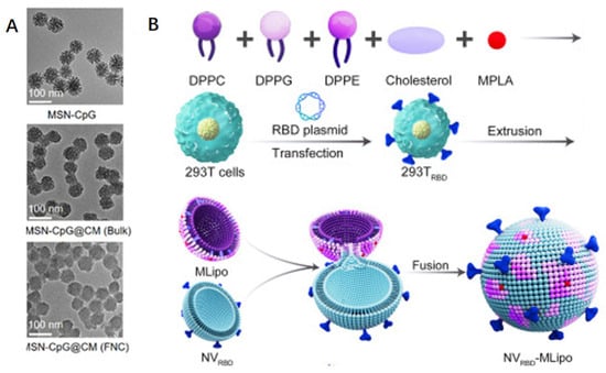 To achieve SARS-CoV-2-related antigen administration, biofilm camouflage nanoparticles can be used, classified into membrane fusion and encapsulation modes. (A) Biodegradable mesoporous silicon nanoparticles (MSNs) enclosed in transgenic cell membranes expressing SARS-CoV-2 RBD are coated with cytosine-phosphate-guanine oligodeoxynucleotide (CpG) []. (B) Nanovaccines produced by effectively fusing PS-biomimetic liposomes carrying MPLA (called MLipo) with transgenic NVs expressing RBD (named NVRBD) [].
