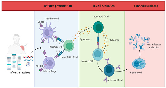 Production of anti-influenza antibodies. The generation of anti-influenza antibodies is generated prophylactically through the application of the influenza vaccine. Antibody formation begins with the presentation of antigens (components of the influenza virus) by dendritic cells and macrophages to naive CD4 lymphocytes, thereby generating activation of B and T lymphocytes. The activated B lymphocytes begin to produce antibodies on their surface, which undergo a maturation process, until finally, the plasma cells generate large quantities of mature antibodies specific for the identification and elimination of the influenza virus [21].
