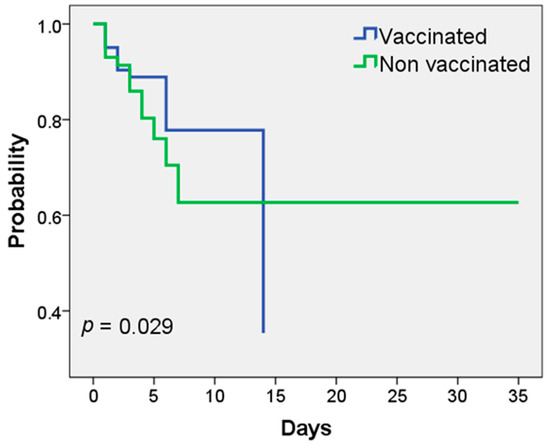 For the survival analysis of patients hospitalized with COVID-19, both the data of patients vaccinated against influenza and those not vaccinated were considered, as well as the days spent in hospital. There was an average of 3.7 days of hospitalization in vaccinated patients versus 6.9 days of hospitalization in non-vaccinated patients, obtaining a statistically significant difference (p = 0.029) in the Long Rank test (Mantel–Cox) (Figure 2).