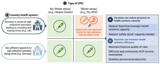 When assessing vaccine impact on drivers of HSS, and choosing the appropriate methodological approach, a distinction should be made between non-epidemic, epidemic and pandemic effects on health systems. The vaccination impact and its magnitude will vary greatly in each case. The existing capacity and average utilisation levels need to be considered, e.g., in countries, such as the UK, that operate at or above target utilisation levels, where increased respiratory infections during winter (‘winter stress’) put pressure on demand for hospital beds [15]. Studies have shown that constrained capacity in the intensive care unit can increase the risk of mortality, as well as healthcare costs [20,21]. Vaccines that prevent respiratory VPDs, such as respiratory syncytial virus (RSV), pneumococcal, or influenza vaccines, could free up healthcare resources and have an impact on HSS during winter stress [15], which can be assessed using opportunity cost approaches.