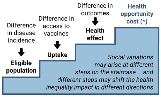 Whereas the first three stairs of the staircase (Figure 2) can be applied to any type of analysis of the impact of health technologies (e.g., public health impact analysis), the health opportunity cost stair for vaccination (within a fixed budget scenario) is specific to CEA/DCEA, as it relates to the question of efficient allocation of more healthcare resources for vaccination to alleviate health inequalities arising within the first three stairs, at the cost of limited funding of other health services. Evidence on the distribution of opportunity costs is limited, and on current evidence, it is not unreasonable to assume that the health opportunity costs of healthcare expenditure are equally distributed across different socioeconomic groups [35].
